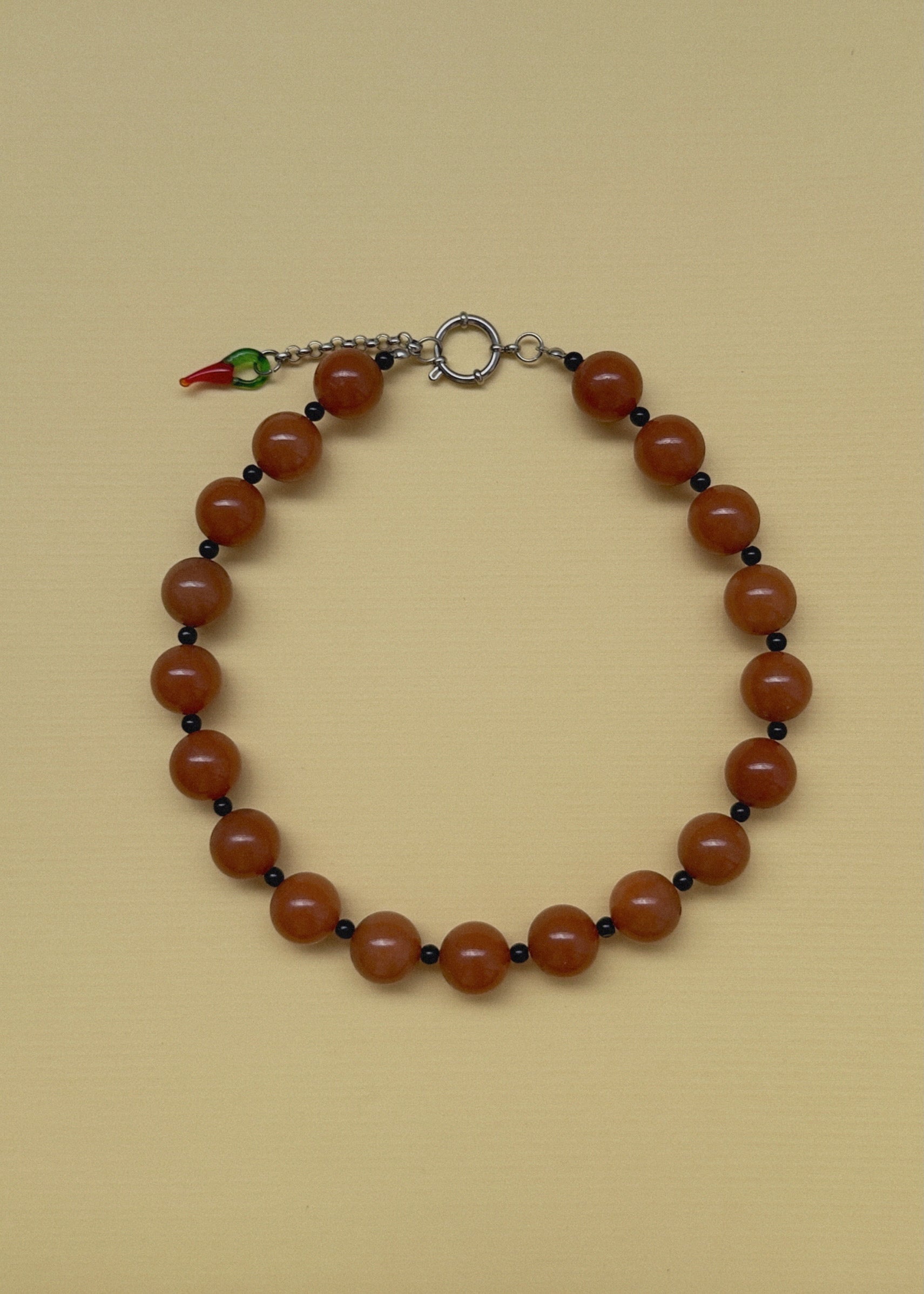 Nuestro collar caramelo, inspirado en esos dulces que amabamos comer en cada piñata! Esta hecho en piedras naturales color caramelo, intercaladas con pepas negras muy pequeñas que general el contraste y balance perfecto. Todos nuestros collares tienen el largo ajustable, terminales en acero inoxidable y la diversión sin fin de la fiesta.