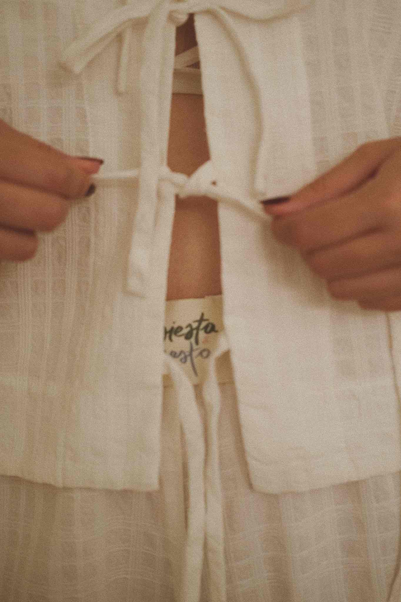 El top tiene una silueta muy cómoda, con un largo medio, manga corta y cordones para anudar, elegimos un short básico para complementar la pijama, con elástico en la cintura y nuestra hermosa marquilla visible en el centro delantero.